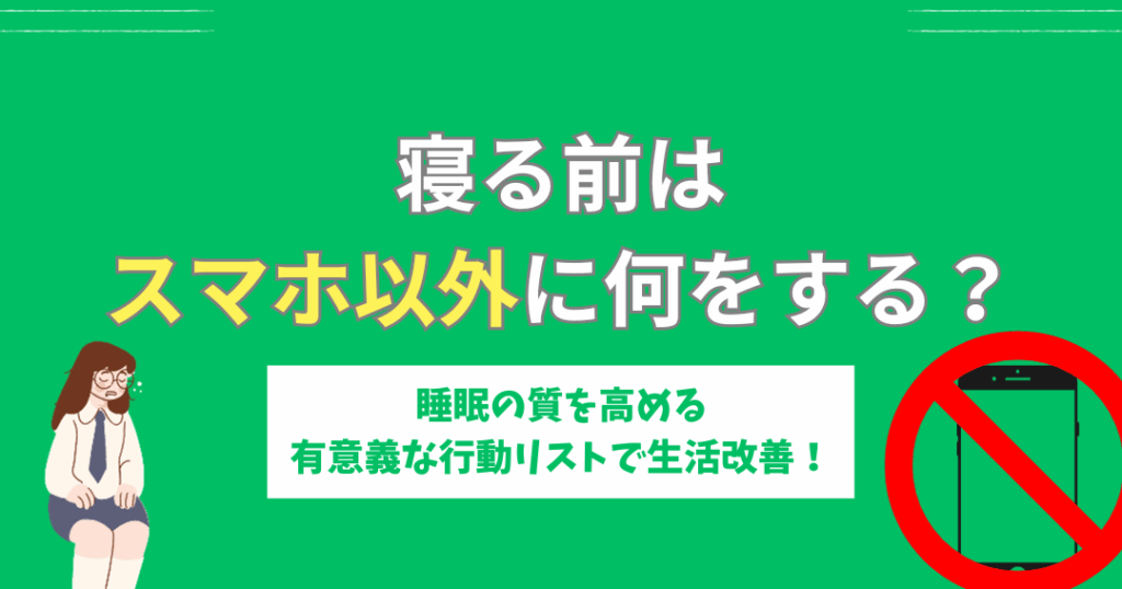 寝る前にスマホを使わない時間が重要です。スマホを使わないことで、心と体をリラックスさせることができます。スクリーンのブルーライトは睡眠の質に悪影響を及ぼすため、他のアクティビティを考えるべきです。具体的には、次のような活動が効果的です。