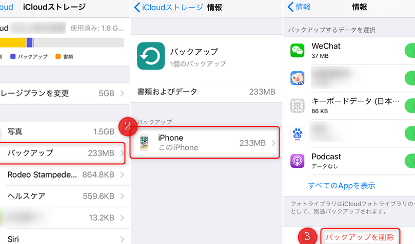 - 削除したいバックアップを選び、削除をタップする。