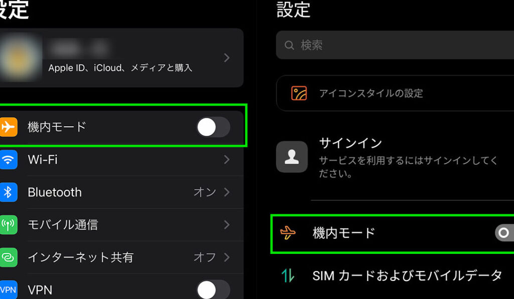 - 機内モードが有効になっていないか確認する