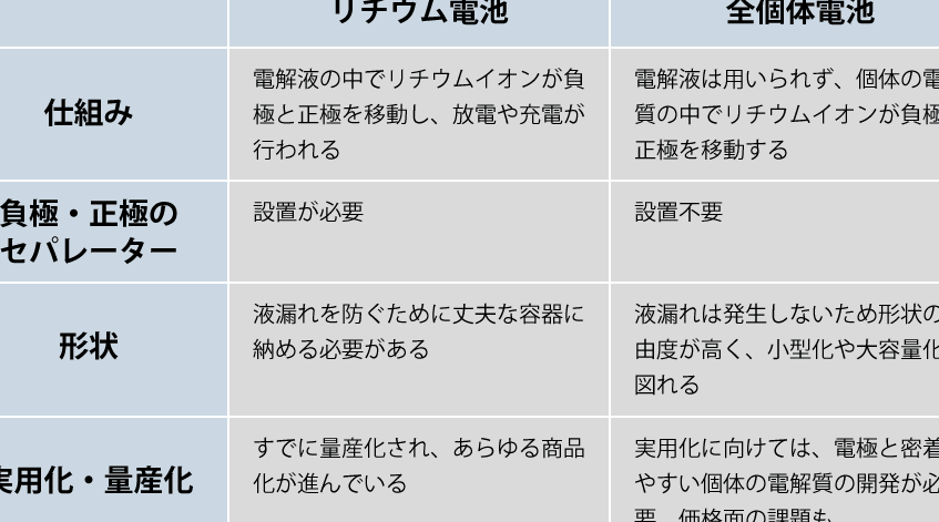 - 安全性の向上:固体電解質を用いることで、火災や爆発のリスクが低下します。