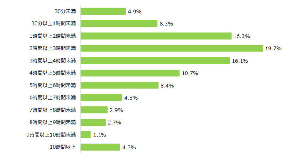 - 20代は、平均約4.5時間。仕事や学業とプライベートの両方で使用される傾向。