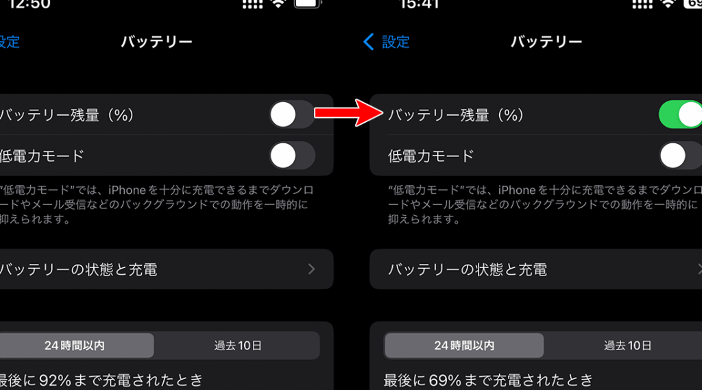 バッテリーセクションへ移動します。この部分では現在の充電パーセントが表示されます。