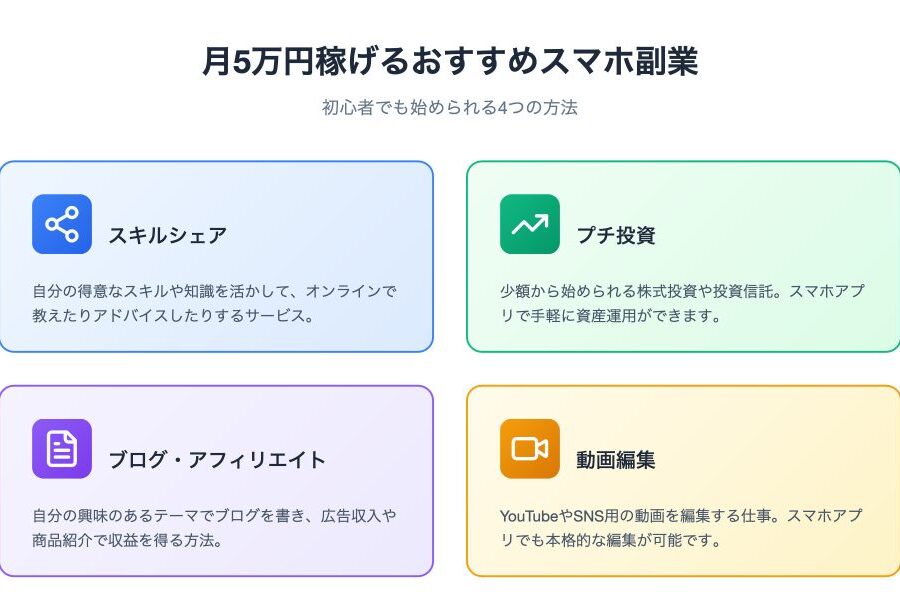スマホ副業 なんjを始める際には、まず自分に合った仕事を選ぶことが重要です。初心者でも気軽に取り組める職種が多く存在し、それぞれの特性を理解することでスムーズにスタートできます。以下では、具体的なステップやおすすめのアプローチについて詳しく説明します。