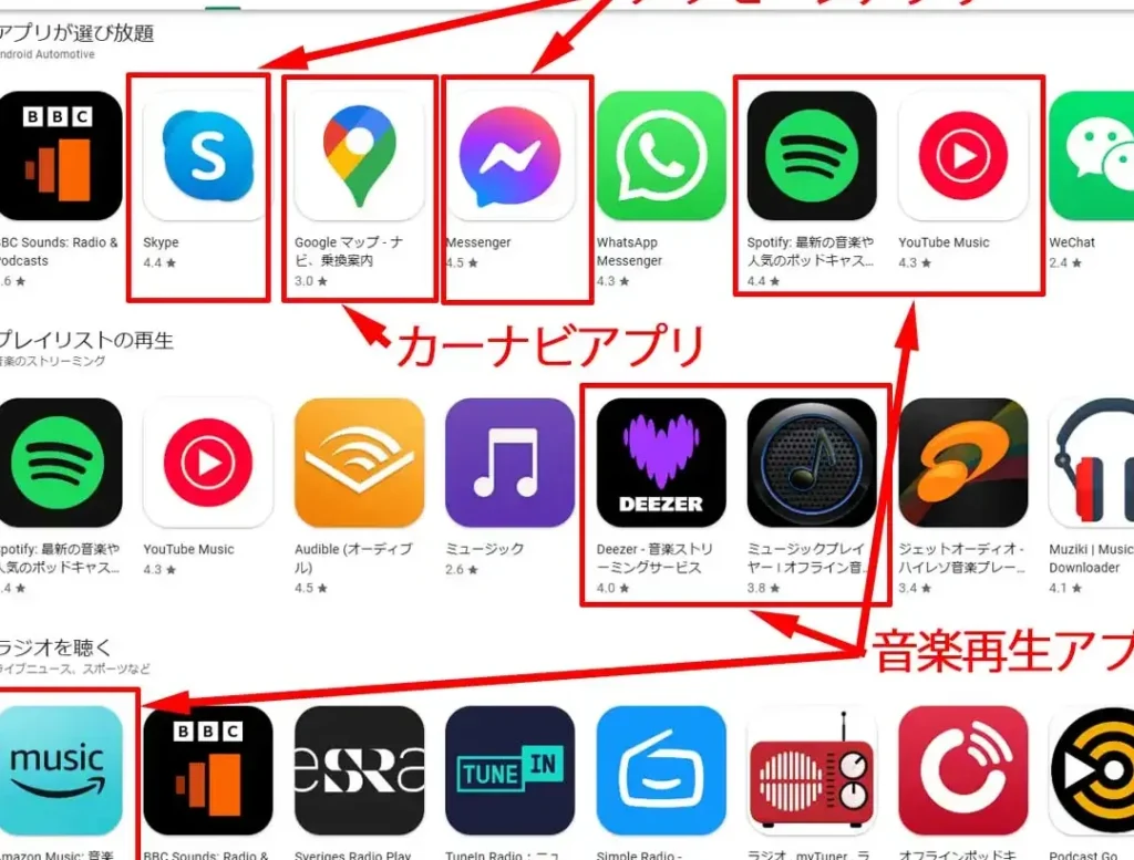 Android Autoでは、多くの音楽ストリーミングサービスやポッドキャストアプリが利用可能です。具体的には次のようなアプリがあります: