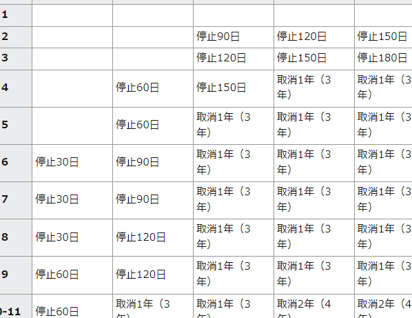 以下は、日本の主要な都市とその罰則内容の一部を示した表です。