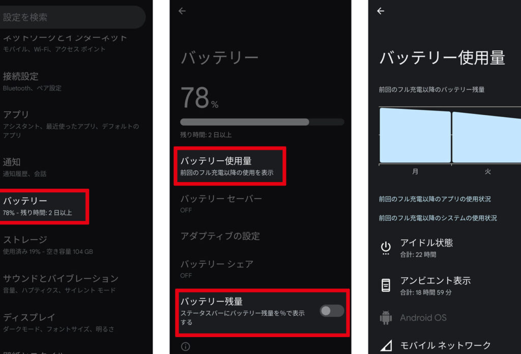 スマホの設定画面から簡単にバッテリー残量を確認できます。多くの場合、ホーム画面にもバッテリーアイコンが表示されています。このアイコンには以下の情報が含まれています: