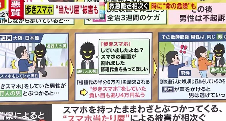 実際に歩きスマホによって引き起こされた事故にはさまざまなケースがあります。以下はその一部です: