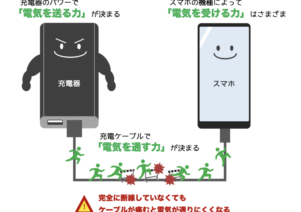 - 断線: ケーブル内部で導線が断裂し、充電できなくなることがあります。