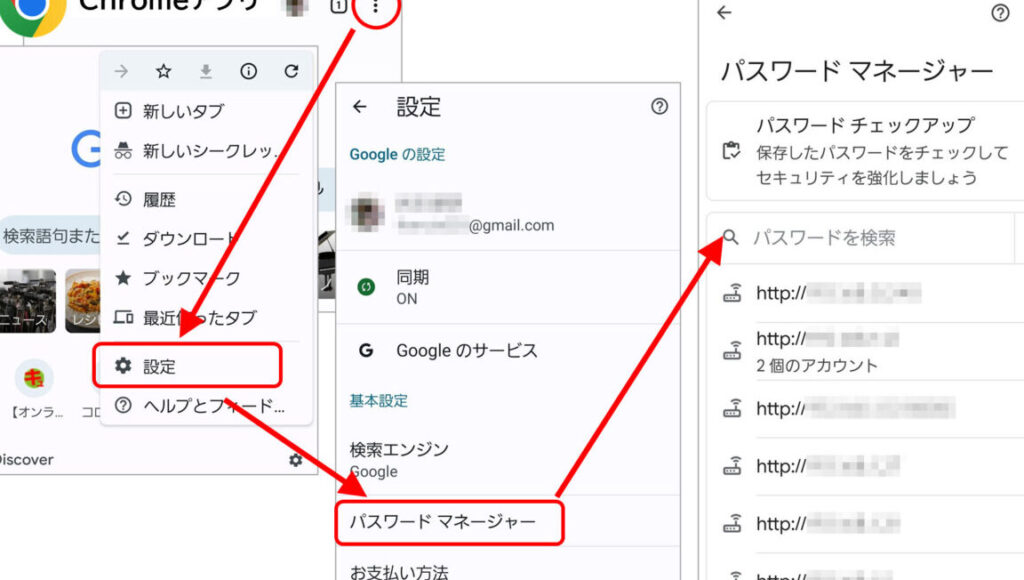 多くの場合、スマホ内蔵ブラウザ(ChromeやSafari)にも保存されたパスワードがあります。例えば: