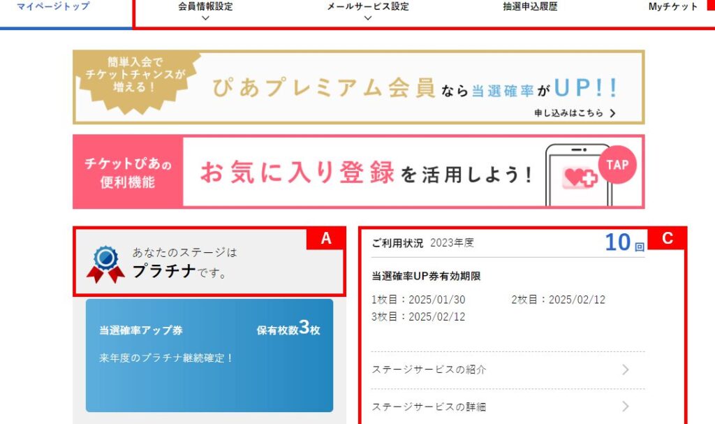 - マイページへの移動: ログイン後、画面上部またはメニューから「マイページ」を選択します。ここで、自分が購入したチケットや予約状況などが一目で確認できます。