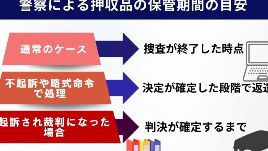 - 簡単なケース: もし押収理由が軽微であったり、自分自身への影響が少ない場合、比較的早めに返却される可能性があります。このような場合では1週間程度で戻ってくることもあります。