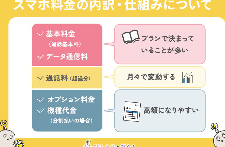 一般的なスマートフォン利用時の月額料金には、主に以下の要素が含まれます。