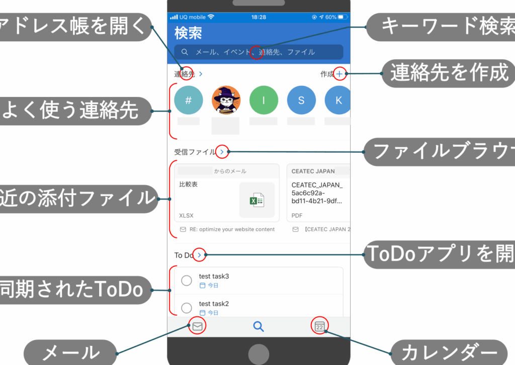 - 見たい連絡先名や電話番号を検索バーに入力し、必要な情報へ即座にアクセスします。